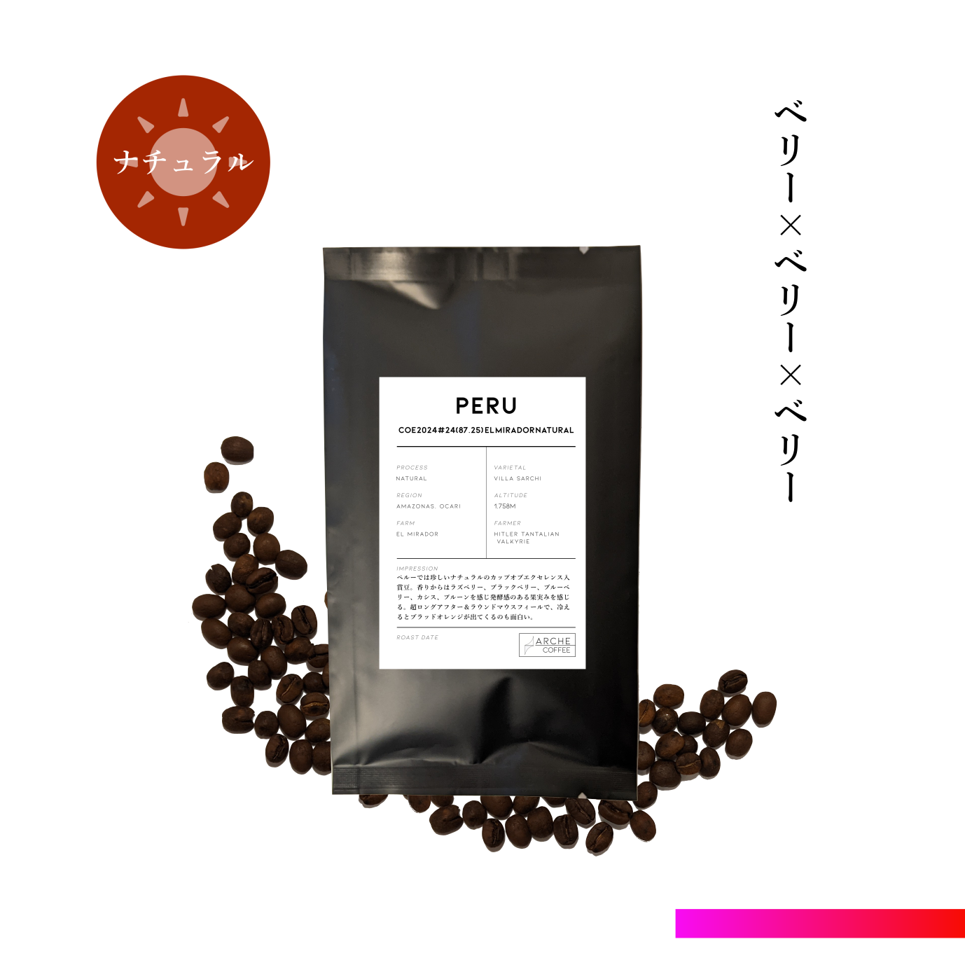 ペルーでは珍しいナチュラルのカップオブエクセレンス入賞豆。香りからはラズベリー、ブラックベリー、ブルーベリー、カシス、プルーンを感じ発酵感のある果実みを感じる。超ロングアフター&ラウンドマウスフィールで、冷えるとブラッドオレンジが出てくるのも面白い。