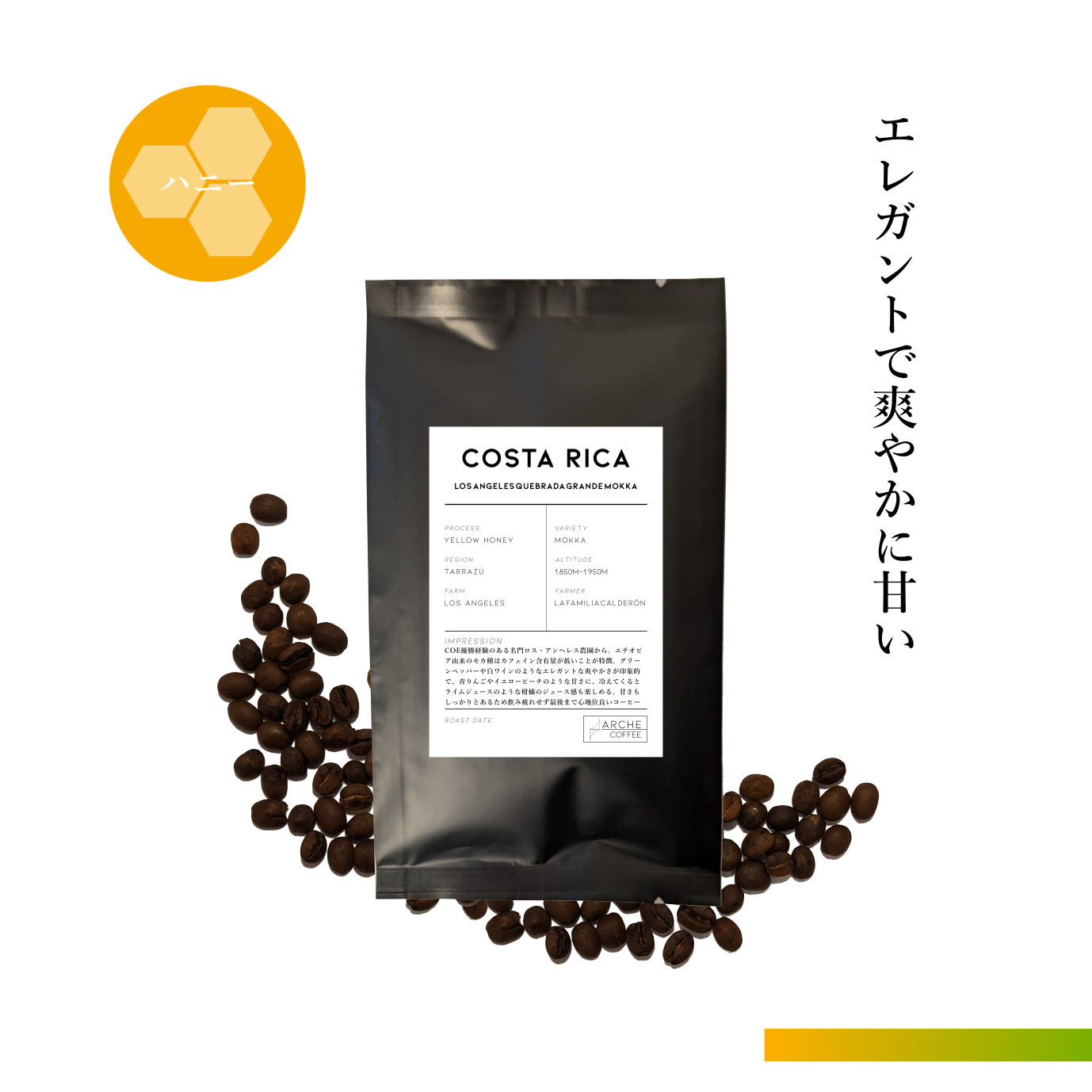 COE優勝経験のある名門ロス・アンヘレス農園から。エチオピア由来のモカ種はカフェイン含有量が低いことが特徴。グリーンペッパーや白ワインのようなエレガントな爽やかさが印象的で、青りんごやイエローピーチのような甘さに、冷えてくるとライムジュースのような柑橘のジュース感も楽しめる。甘さもしっかりとあるため飲み疲れせず最後まで心地位良いコーヒー